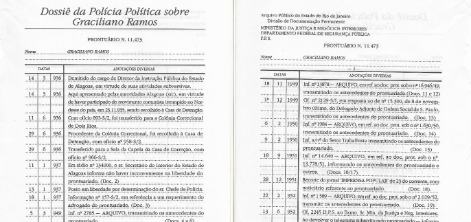 Considerado um dos mais importantes escritores da língua portuguesa, o alagoano Graciliano Ramos (1892–1953), autor de obras como Vidas Secas e São Bernardo, foi preso em sua residência em Maceió, no dia 03 de março de 1936. Segundo a ficha do escritor, a prisão ocorreu em decorrência de suas “atividades subversivas”. A acusação, nunca formalizada, era de conspiração num frustrado levante comunista de novembro de 1935.
