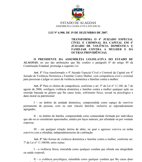 De acordo com a Lei Estadual 6.900, de 19 de dezembro de 2007, que instituiu o 4º Juizado, configura-se violência doméstica e familiar contra a mulher "qualquer ação ou omissão em razão de gênero que lhe cause lesão, sofrimento físico, psicológico e dano moral ou patrimonial, praticada no ambiente doméstico, familiar e nas relações íntimas e de afeto."